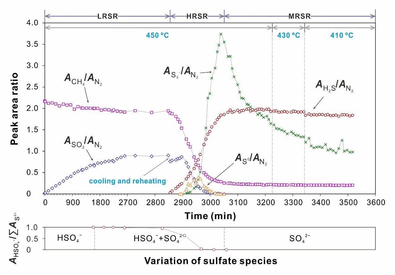 Their results indicate that sulfate is transformed to H2S through a series of reduction and disproportionation reactions. For example, in the Na2SO4-H2SO4-CH4-N2-H2O system (Fig. 1, where N2 is used as an internal reference), sulfate is first reduced by methane to form SO2. Then, SO2 is further disproportionated or reduced to form H2S. The interaction between high valence sulfur species and H2S leads to the formation of intermediate valence sulfur species (i.e., S3- and S0), which directly oxidize methane to form H2S and CO2. This study provides direct evidence that both S3- and S0 can oxidize hydrocarbon, contributing to the autocatalytic effect observed in the TSR reaction. The transformation of sulfur species during TSR reaction is illustrated in Fig. 2.