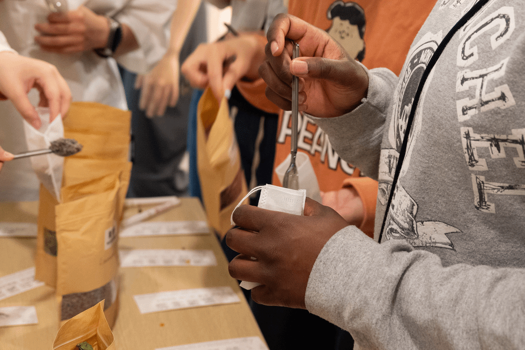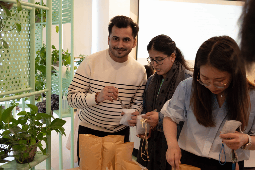 The cultural immersion began with the process of sachet making. The center prepared a variety of medicinal herbs, including peppermint, peach blossoms, mugwort, and lemongrass, etc. , each offering a unique benefit such as repelling mosquitoes, refreshing spirits, enhancing fragrance, and aiding sleep. Students were invited to sniff and choose from this array of herbs to their liking. Guided by instructors, participants filled a small bag with their selected botanicals, then slipped it into an elegant sachet. Then students could either wear the sachets or engage it into the later handwork.