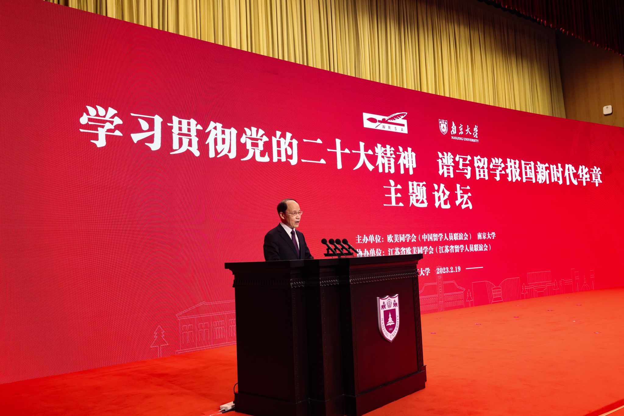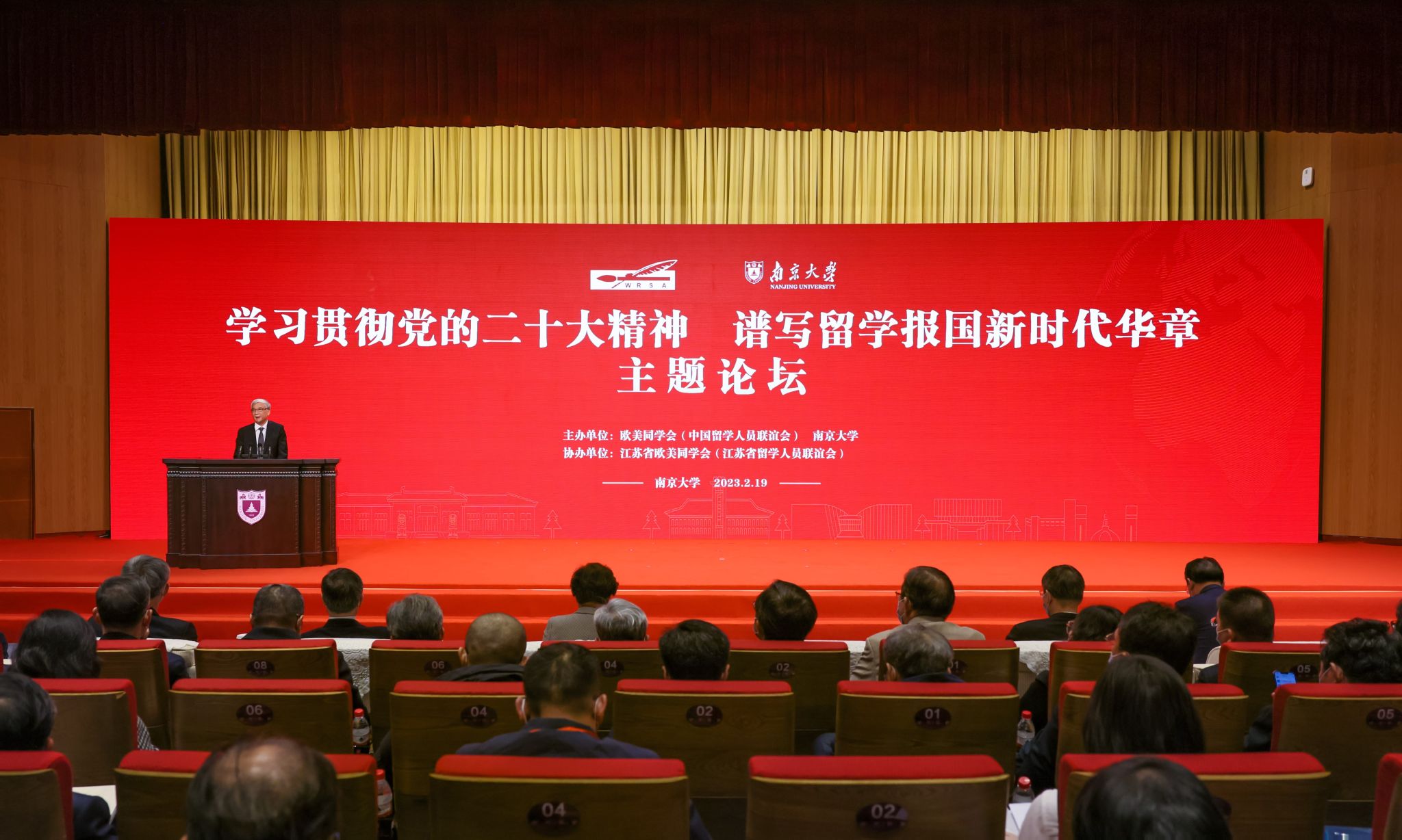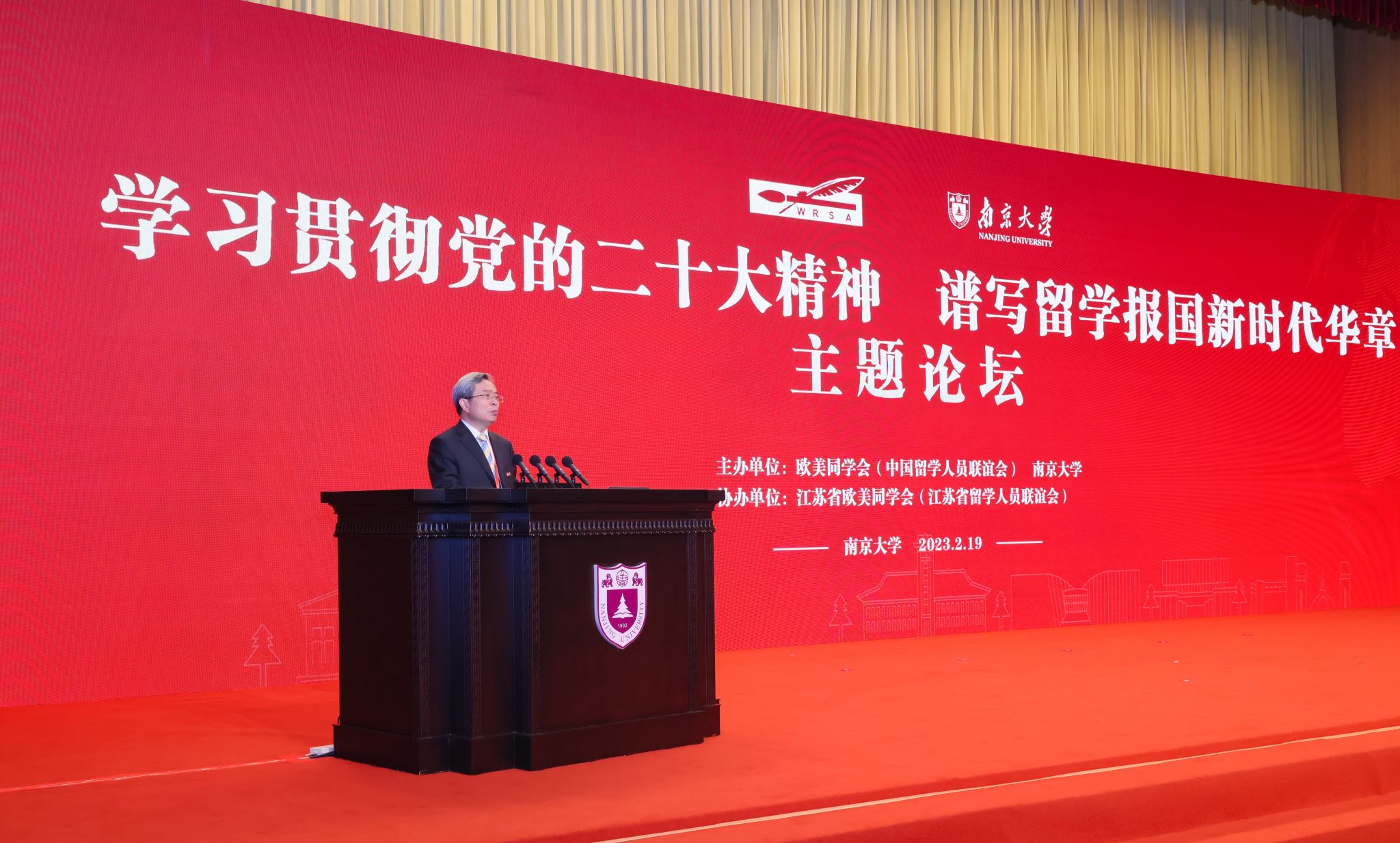 On February 19, NJU Forum for Scholars Returned from Overseas was held at Xianlin. The forum was co-organized by the Western Returned Scholars Association (Overseas-educated Scholars Association of China), NJU and Jiangsu Returned Scholars Association. Ding Zhongli, Vice Chairman of the Standing Committee of the National People’s Congress, President of the Western Returned Scholars Association and Academician of the CAS, Chen Xu, Vice Minister of the United Front Work Department of CPC Central Committee and Director of the Overseas Chinese Affairs Office of the State Council, Wang Jiayi, Member of the CPC Leadership Group and Vice Minister of the Ministry of Education, Hui Jianlin, Standing Member of the CPC Jiangsu Provincial Committee and Minister of the United Front Work Department of Jiangsu Province, and Tan Tieniu, Academician of the CAS and Secretary of the CPC NJU Committee, attended the forum. Wang Pijun, Secretary of the CPC Group and Secretary General of the Western Returned Scholars Association, presided over the opening ceremony. Yang Zhong, Executive Deputy Secretary of the CPC NJU Committee, presided over the main forum.