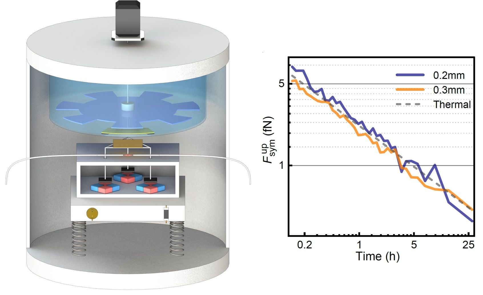Figure 1. The precision measurement system for the fifth force based on a magnetically levitated mechanical oscillator (left panel) and the experimental results of force measurement (right panel).
