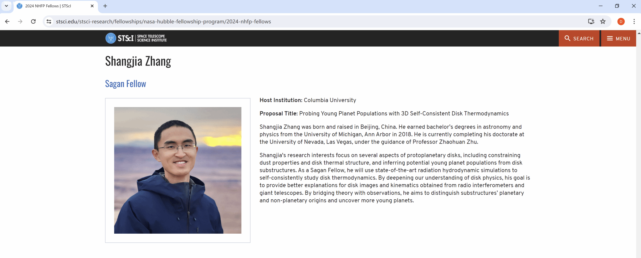 On April 2, 2024, the National Aeronautics and Space Administration (NASA) announced the list of 24 young scientists selected for the 2024 NASA Hubble Fellowship Program(NHFP). Shangjia Zhang , an undergraduate alumnus from the School of Astronomy and Space Science at Nanjing University, was presented with "The Sagan Fellow."