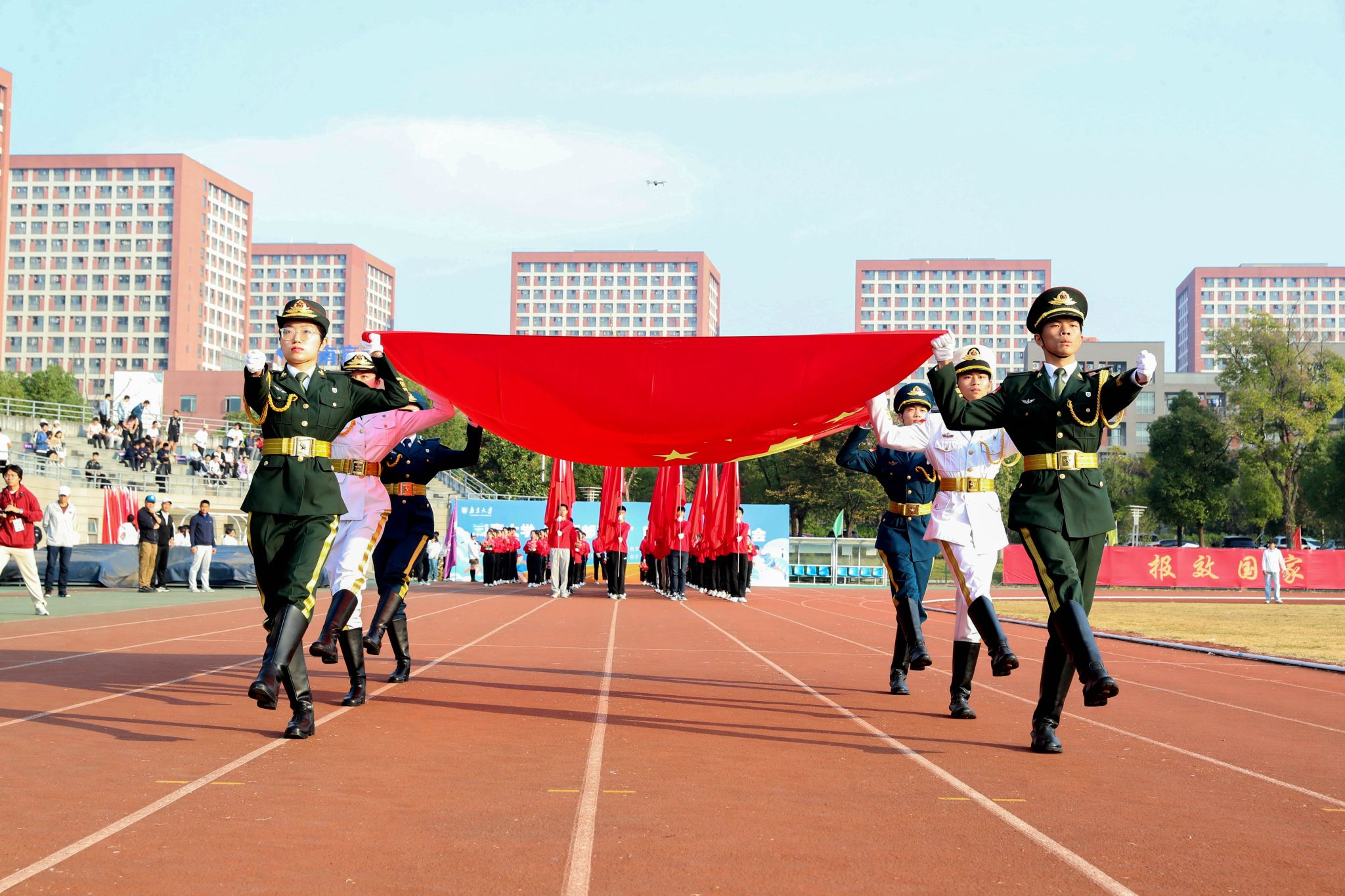 迎着朝阳,在激昂的乐曲声中,国旗护卫队成员英姿飒爽、步履铿锵,护送庄严的五星红旗,昂首阔步朝主席台走来。在国旗方阵、彩旗鲜花方阵带领下,运动员方阵怀着饱满的热情、昂扬的斗志依次入场。全体师生列队肃立,注视着五星红旗冉冉升起,齐声高唱《中华人民共和国国歌》。