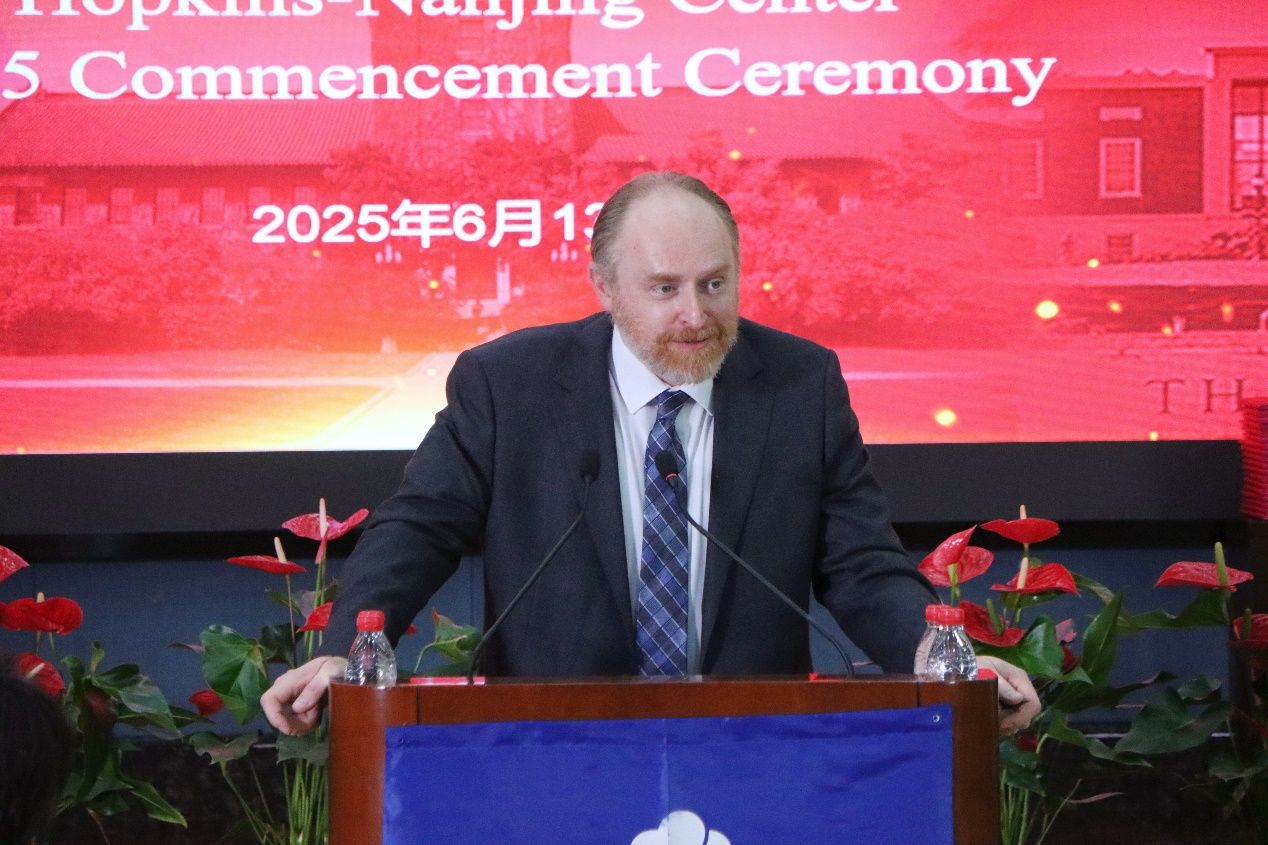 陆延青向全体毕业生致以祝贺,并对中美中心全体教职员工及海内外学生家长致以诚挚谢意。他表示,凯发k8官网与约翰斯·霍普金斯大学携手共建的中美中心,不仅是两校深厚友谊的见证,更是中美人文交流与高等教育合作的重要平台。他寄语毕业生三点期望:一是坚韧不拔、以诚为先,面对挑战与机遇,始终保持诚信品格与坚韧意志。二是勤于自省、善于反思,“以人为鉴”“以史为鉴”,在理性思考中认识自我、洞察世界。三是胸怀天下、勇于担当,秉持 “嚼得菜根,做得大事”的信念,肩负促进中美友好交往与文明互鉴的责任,将个人理想融入人类发展的洪流,为中美友好与世界和平贡献青春力量。陆延青引用古诗“自小刺头深草里,而今渐觉出蓬蒿。时人不识凌云木,直待凌云始道高”,以小树苗历经成长终成参天大树为喻,指出中心学子恰似初露锋芒、蓄势待发的新苗,必将带着东方智慧与全球视野,勇敢直面挑战,坚定追逐梦想,成为卓越人才。