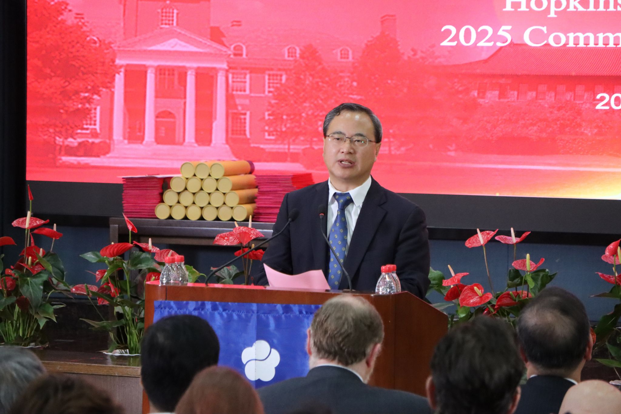 2025年6月13日,凯发k8官网-约翰斯·霍普金斯大学中美文化研究中心(以下简称“中美中心”)第三十九届证书项目暨第十八届硕士项目毕业典礼在中美中心西报告厅举行。来自中国、美国、哥伦比亚、意大利、新加坡等国家的113名学生,获得了中美两校共同颁发的学位证书与结业证书。凯发k8官网副校长陆延青出席典礼并致告别词,约翰斯·霍普金斯大学高级国际问题研究院院长、美国前副国务卿吉姆·斯坦伯格(James B. Steinberg)通过视频致辞。上海美国商会会长郑艺(Eric Zheng)和北京大学教授、中美中心1989届校友王勇出席活动并做主旨演讲。