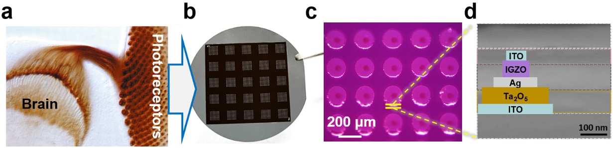 图2. 垂直集成的尖峰视锥感受器阵列及器件示意图。