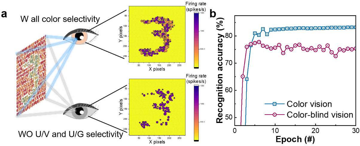 该团队设计了"色盲测试"风格的混色手写数字数据集作为测试样本,来验证该器件的颜色感知能力。实验表明上述器件能以高准确率通过"色盲测试"(图4)。以该VISCP器件为基本模块,可望构建具有复杂颜色感知能力的硬件尖峰神经网络(SNN)系统,并可能在智能机器人和人工眼等新兴领域产生转化效应。