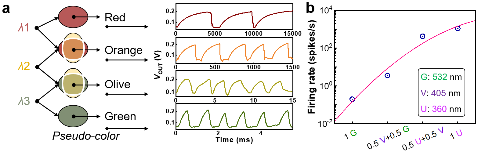 这种VISCP的输出尖峰频率范围为0.1-1200 Hz,对可见光的响应功耗小于400 pW,这些特点都十分接近生物视锥细胞。该器件对三种波长(532 nm、405 nm和360 nm)的光,表现出超过1.5个数量级的尖峰响应频率频率,这使其具有出色的颜色分辨能力(图3)。