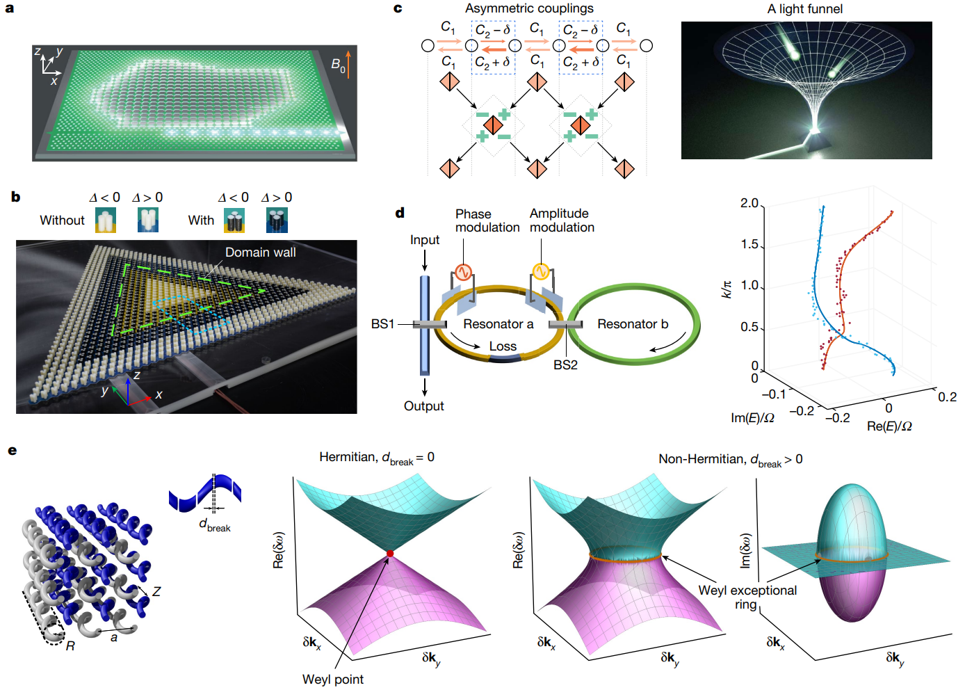 图2. 非厄米拓扑现象。(a)光学拓扑激光器。(b)声学非厄米拓扑微腔。(c)在具有不对称耦合和非厄米点带隙的系统中实现非厄米趋肤效应。(d)在光学系统中,基于振幅和相位调制器实现非厄米复能带的编织。(e)将散射损耗引入光螺旋波导阵列中,原本无损耗时的厄米外尔点扩展成了非厄米的外尔奇异环。