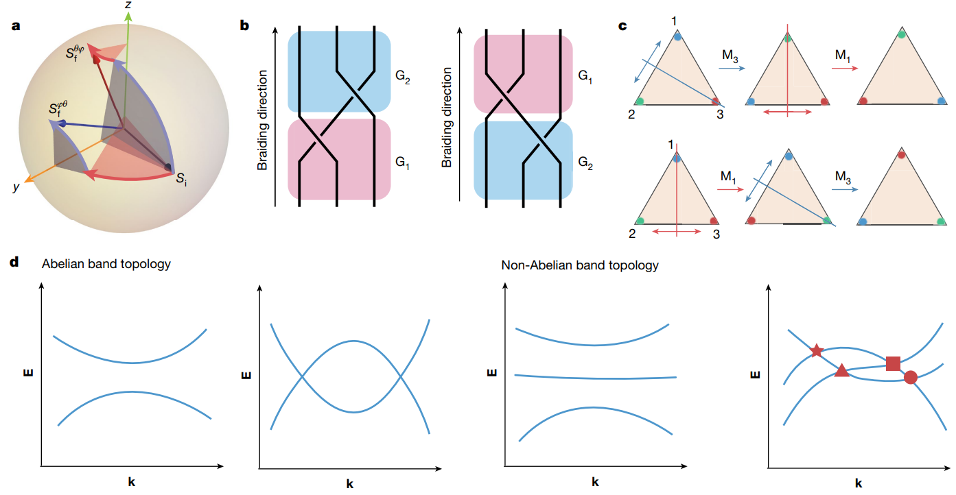 图4. 非阿贝尔波动物理,算符的不可交换性形成了非阿贝尔结构。(a)SU(2)群,其中含时调制和法拉第效应分别对应两个旋转算符。(b)编织群,其中沿着某些参数循环的状态演化表现为编织算子。(c)置换群,其中在非厄米系统中交换的本征态表现为置换算符。(d)与阿贝尔拓扑不变量表征的双带模型相比,具有实本征态的多带模型涉及到非阿贝尔能带拓扑,图中符号表示由非阿贝尔群元素表征的能带节点。