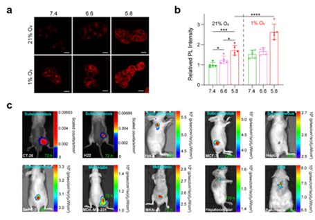 随后,如图2,作者研究了肿瘤细胞对探针的摄取以及探针在肿瘤细胞内的响应情况。结果显示,在pH 7.4时,将氧浓度从21%改变为1%,细胞中Ir-D探针信号显著增加;1%氧浓度时,降低pH会进一步增加磷光信号,Ir-D纳米探针具有pH特异性以及乏氧响应特性。进一步地,作者构建了多种类型的小鼠肿瘤模型验证了两步串联响应的探针对于肿瘤检测的特异性,Ir-D探针在多种皮下瘤、转移瘤以及PDX肿瘤模型中都能实现高灵敏度的成像。