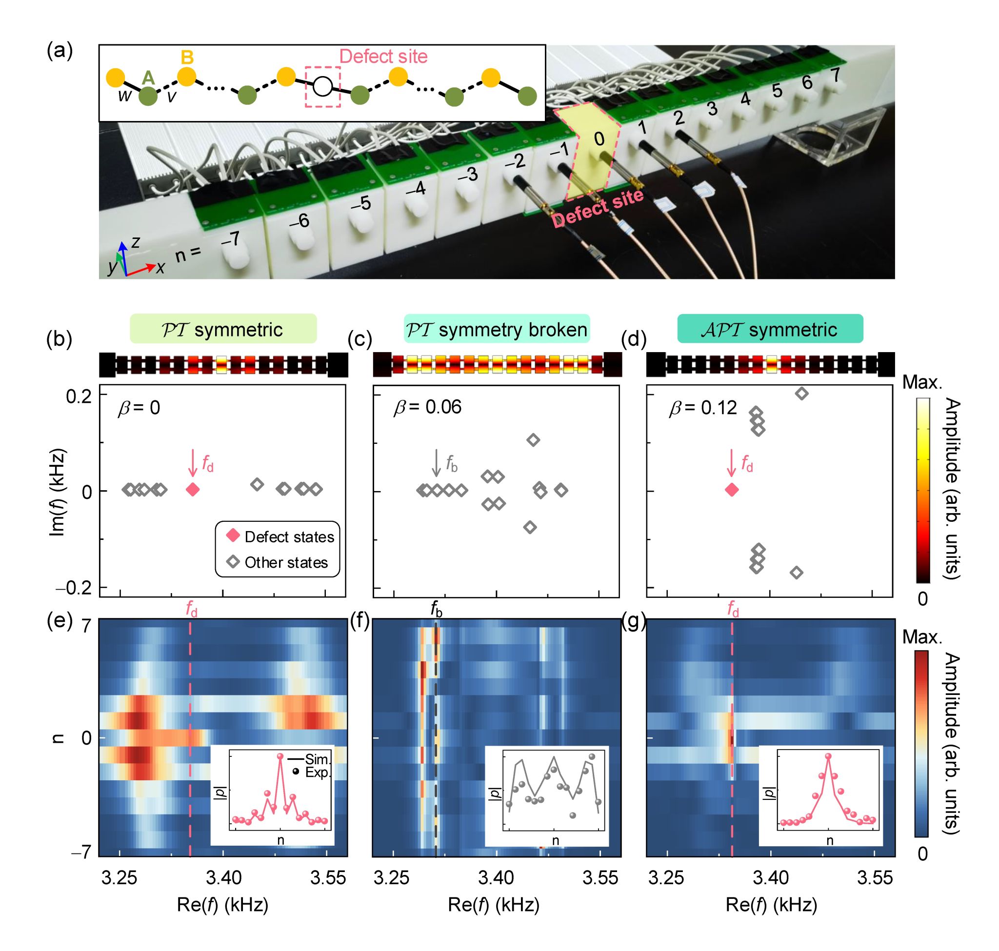 此外,研究人员还研究了声学非厄米SSH晶格中的拓扑缺陷态。如图3所示,他们通过在非厄米声子晶体晶格中引入一个缺陷位点,从理论和实验两个层面研究了拓扑缺陷态与PT对称性的关联。研究发现,拓扑缺陷态存在于PT对称相态下,在PT对称破缺相态中消失,然而在APT对称相态下重新出现。进一步的研究表明,在处于PT对称相态和APT对称相态时,拓扑缺陷态对应的声能量呈现出截然不同的局域模式。