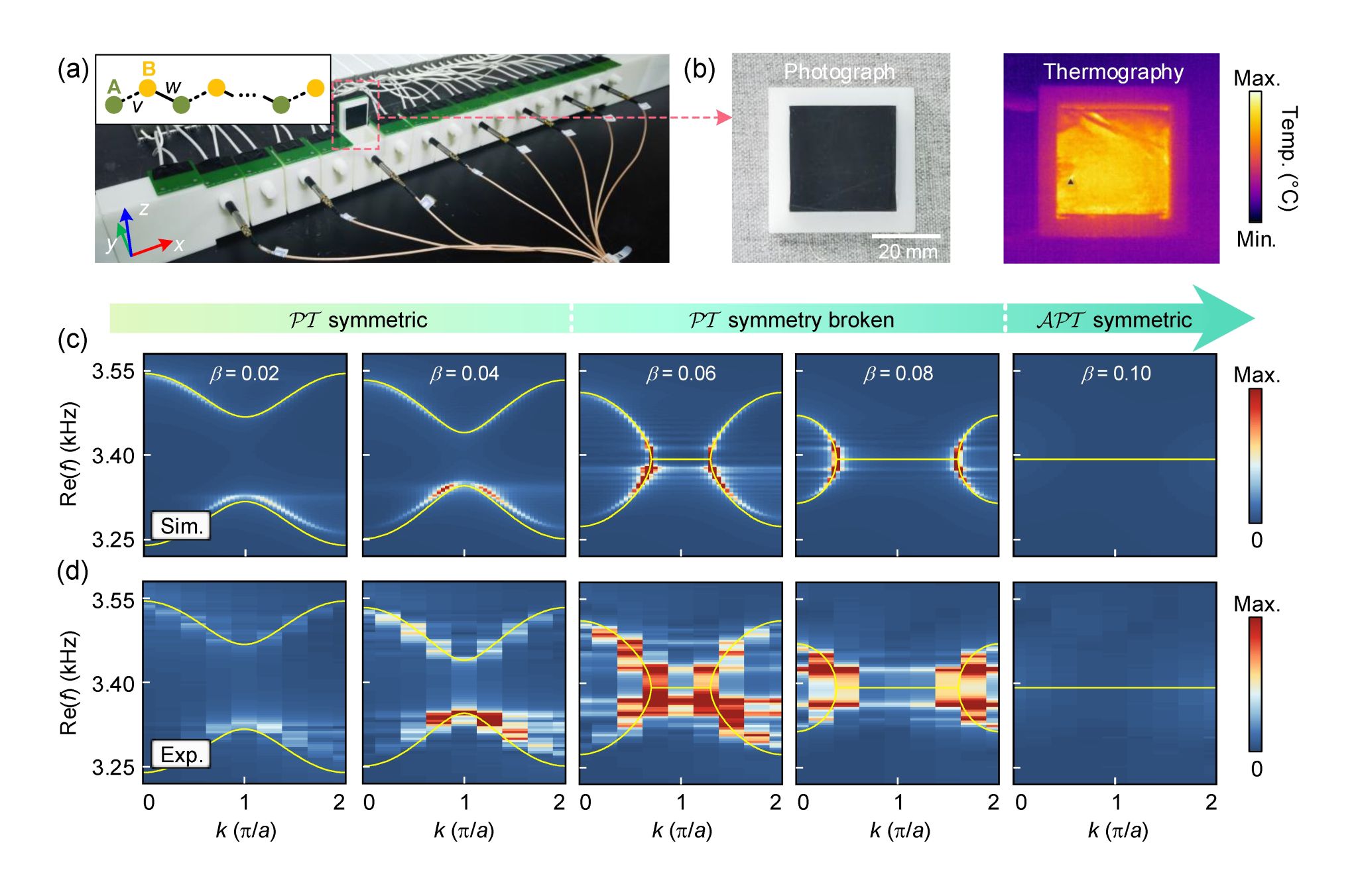 为了实验验证上述PT对称相态的转变过程,需要在声学系统中引入较大幅度的非厄米调制。为此,研究人员将声增益和声衰减类比为声学集中参数模型中的额外声阻抗,并利用电控碳纳米管(CNT)薄膜的热声效应成功构造了声学系统中的等效增益和损耗基元。在图2所示的具体实验中,研究人员在声学耦合共振腔体的顶盖上涂覆了CNT薄膜,并将其连接到一个预编程电路板。通过精确调节输入电流信号的幅度和相位,成功实现了对声学系统非厄米因子的动态调控。然后,构建了一维有限长的非厄米SSH声子晶体链,通过逐步增加非厄米强度,探测声子晶体色散曲线,实验观测到了系统在不同PT对称相态之间的转变过程。