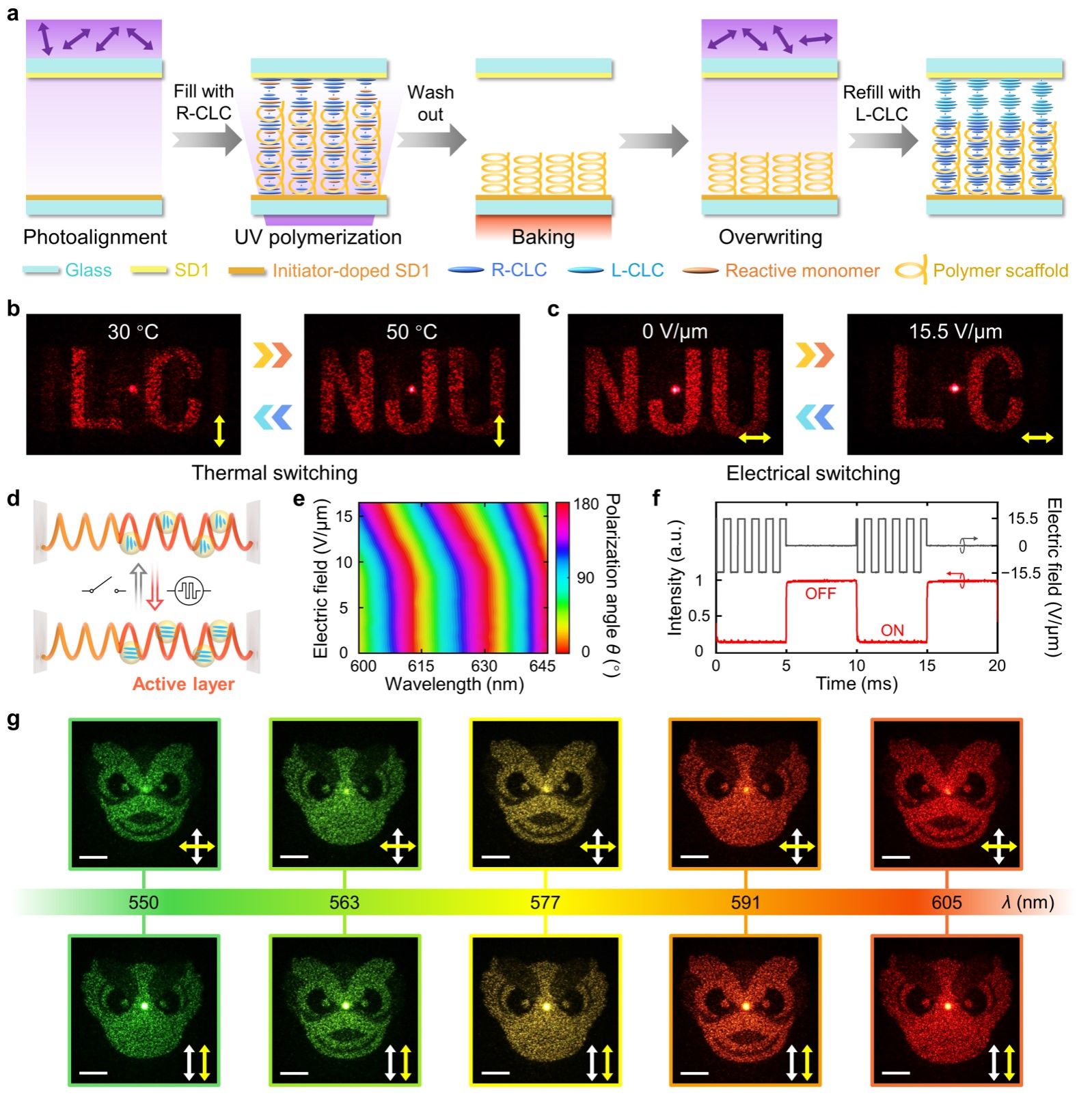 得益于胆甾相液晶丰富的刺激响应性,双手性液晶超结构的反射式旋光色散效应也会在多元外场刺激下变化,而预先编码的自旋解耦几何相位却不受外场影响,这使复杂光场的动态调控成为了可能。在单色光入射下,研究组实现了全息重建图像在热、电场刺激下的可逆动态切换(图2b-c)。初始状态下,检偏片清晰地滤出了“LC”(或“NJU”)的图像,而在特定的温度或电场下,反射光场的偏振方向整体旋转90°,于是,检偏片滤出的图像切换为另一线偏振通道的“NJU”(或“LC”)。值得关注的是,电调双手性液晶超结构采用了聚合物分散胆甾相液晶作为主动层,响应时间可达36 μs(图2d-f),比普通液晶光学器件快2~3个数量级,为超快多维光场调控提供了新策略。