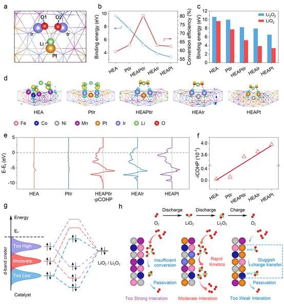 2. (a) LiO2在HEAPtIr (111) 晶面上的吸附模型;(b) LiO2与五种催化剂之间的结合能以及使用相应催化剂的LOB的能量转换效率;(c) LiO2和Li2O2与催化剂之间的结合能;(d) LiO2与催化剂相互作用时的差分电荷密度(黄色和蓝色区域分别表示电子密度的增加和减少);LiO2吸附在五种催化剂(111)表面后O1和O2原子之间的(e) -pCOHPs和(f) -iCOHPs;(g) LiO2/Li2O2与具有不同d带中心催化剂之间的轨道相互作用和(h) 相应的催化效果示意图。