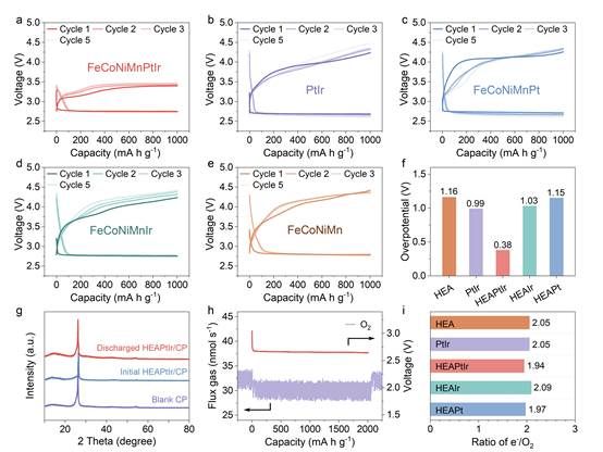 1. (a-e) 五种合金催化剂在200 mA g-1,1000 mAh g-1的测试条件下的充放电曲线及(f) 在500 mAh g-1时相应LOB的过电位;(g) 空碳纸(CP)正极和放电前后HEAPtIr/CP正极的XRD衍射图谱;(h) 1000 mA g-1,2000 mAh g-1测试条件下HEAPtIr正极放电时的原位DEMS曲线;(i) 放电时五种合金催化剂的e-/O2比。