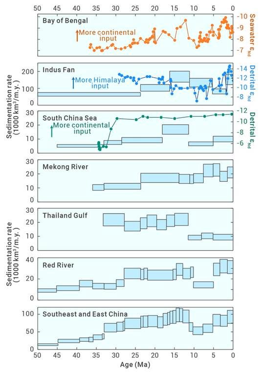 图3. 亚洲边缘海和太平样沉积记录揭示50 Ma以来亚洲大河和气候的演变