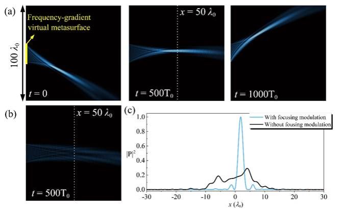 图3. (a)超构聚焦声呐所产生的动态扫描声束;(b)未引入聚焦调制的超构声呐所产生的动态扫描声束在t = 500T0时的空间分布;(c)两种超构声呐在t = 500T0时刻、x = 50λ0位置处的一维空间声强曲线对比。