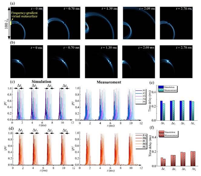 图2. 时空干涉声场的(a)理论计算和(b)数值仿真结果;(c,d)扫描区域内10个探测点位置处实验接收到的时域信号结果;(e,f)相邻两个探测点间的时延。