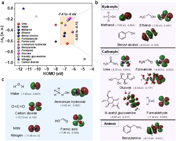 5. 三价镍电氧化有机物的通用性。(a)以亲核原子?sk和小分子的HOMO能级作为描述符,筛选Ni3+有效氧化的有机物。(b)可被Ni3+氧化的有机物HOMO能级和结构式。(c)不可被Ni3+氧化的有机物的HOMO能级和结构式。