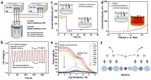 4. 三价镍直接电荷转移动力学。(a)双化学工作站监测电极反应动力学。(b)当阳极电位在1.45 V和1.4 V之间阶跃时,电池反应动力学。(c)含有丁二酮肟钠盐的电解液中的恒电压反应及实时电解液光学照片。(d)含有丁二酮肟钠盐的电解液中CV循环扫模拟电子转移经由Ni(OH)2/NiOOH氧化-还原过程的电解液光学照片。(e)阻抗谱监测催化层/体相和催化层/电解液界面电子转移动力学。(f)通过Ni3+ (t2g6eg1)未占据的eg轨道进行直接电子转移示意图。