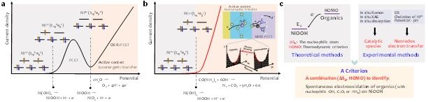 通过静态线性扫描伏安曲线、原位拉曼谱、原位紫外可见吸收谱、原位X射线近边吸收谱、开路电压衰减、快速切换电位等手段,我们发现三价镍氧化尿素是自发反应,且动力学过程极快。通过引入丁二酮肟耦合剂监测Ni2+离子(监测浓度极限nM,时间尺度ns),确认了Ni3+氧化尿素为亲核攻击和空轨道直接转移电子机制,这种非氧化还原的三价镍在氧化有机物中表现出优异的动力学特性。理论计算和实验证实,能够被三价镍高效氧化的有机物的HOMO能级在-7.4 eV到-6 eV(相对于真空能级)之间;并且其亲核官能团中亲核原子?sk在-0.65到-0.15之间。有机物亲核官能团可以是羟基(甲醇、乙醇、苯甲醇)、羰基(甲酰胺、尿素、甲醛、葡萄糖和N-乙酰氨基葡萄糖)和氨基(苄胺)。快速的电氧化动力学可归因于有机物分子亲核位点和Ni3+ (t2g6eg1)未占据eg轨道的等能电子转移通道的建立。因此,我们可以清晰地描述完整的电化学电子转移过程,对于电催化氧化反应来说,外电压首先将活性中心从低价态极化到高价态,此过程可能伴随质子耦合电子转移的相变过程,处于高价态的催化活性中心与分子基元反应步物种通过轨道交叠形成成键轨道作为电子转移的能量通道,二者之间电子转移遵循Marcus电荷转移理论,即发生宏量等能电子隧穿,而催化中心则通过高价活性离子的未占据轨道直接转移电子,此时催化中心并不发生价态变化,通常遵循双/超交换机制转移电子至外电路。我们的发现对于设计高效催化剂和筛选动力学快速的有机电氧化具有重要借鉴价值。