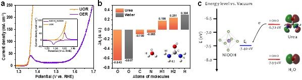 2. 水氧化和尿素氧化的本质差异。(a)尿素氧化(UOR)和水氧化(OER)极化曲线对比。(b)以尿素和水分子中每个原子的?sk识别亲核原子。(c)尿素和水的HOMO能级和NiOOH的费米能级对比。