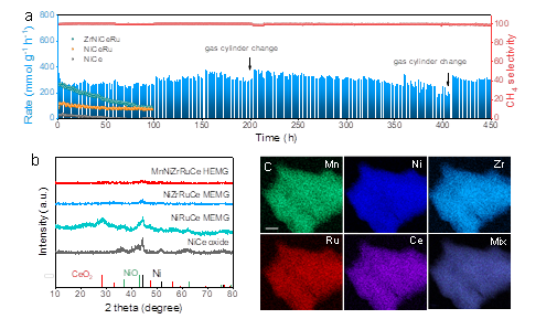图4 稳定性评估。(a)在300℃、H2/CO2 = 4/1、流速为22.5 mL·min-1、压力0.1 MPa、光强1.14 W·cm-2条件下的稳定性测试;(b)光热催化反应后NiCe氧化物、NiRuCe MEMG、NiZrRuCe MEMG、MnNiZrRuCe HEMG的XRD图;(c)HEMG反应后的元素分布图,比例尺为100 nm