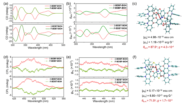 2. (a)甲苯溶液中(R/S)-BDBF-BOH和(R/S)-BDBT-BOH的CD光谱;(b) 甲苯溶液中(R/S)-BDBF-BOH和(R/S)-BDBT-BOHgabs-波长曲线;(c)和(f) 计算的(S)-BDBF-BNO和(S)-BDBT-BNO的S1态的跃迁电偶极矩(红色箭头)、磁偶极矩(蓝色箭头)和夹角;(d) (R/S)-BDBF-BOH和(R/S)-BDBT-BOH的CPL光谱;(d) gPL-波长曲线。