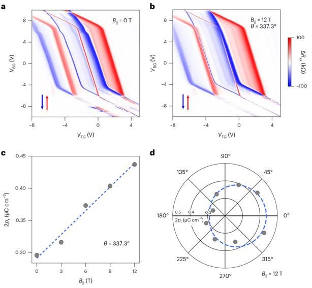 然后,研究团队对器件施加了水平磁场B∥,研究了磁场对铁电行为的调控作用。实验发现,当B∥ = 12 T时,Rxx在双栅扫描下所呈现的铁电回滞曲线与零磁场时具有显著的差异(图2a, b):2pr与B∥的变化呈现出线性依赖关系(图2c);而在改变B∥的方向时,2pr展现出强烈的各向异性特征(图2d)。进一步,根据图2c中的直线斜率,研究团队计算了相应的磁电耦合系数
