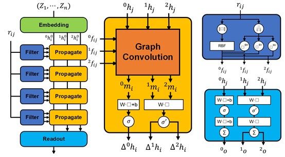 由于等变操作的复合仍然是等变的,因此可以通过将一系列基础的等变操作的耦合,搭建出复杂的神经网络。注意到张量间的缩并正是一个可以将不同阶张量耦合的操作,为此孙建课题组使用节点上的已有的高阶张量与边所对应的原子间相对位移的直积构成的高阶张量进行缩并,成功将消息传递中允许的张量阶数提升到了任意维。