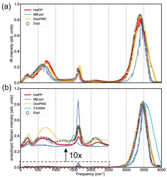图2:HotPP与其他力场计算的红外与拉曼光谱跟实验数据的比较。