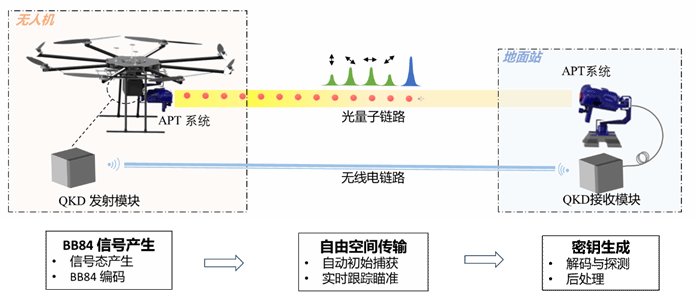 想要基于无人机移动平台实现量子密钥分发,系统的重量、体积、稳定性等方面面临多项技术挑战。研究者们通过若干核心技术的原创设计与研发成功解决了所有挑战,实现了首例无人机与地面站之间的量子密钥分发,实验的流程见图1。