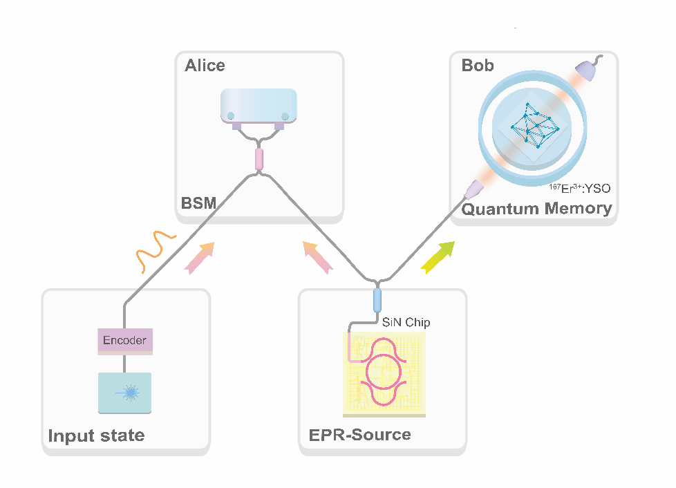 在量子网络中,光子传输损耗随距离的指数级增长是限制长距离通信的主要原因。量子中继通过结合纠缠光源、量子存储器和量子隐形传态等技术,可将损耗大大减少,从而实现可拓展的量子网络。因此,将纠缠光源、量子存储器与量子隐形传态相结合,对未来构建可扩展的长距离量子网络具有重要意义。尽管量子网络领域发展迅速,但通信波段的光子与存储器之间的量子隐形传态一直未能实现。