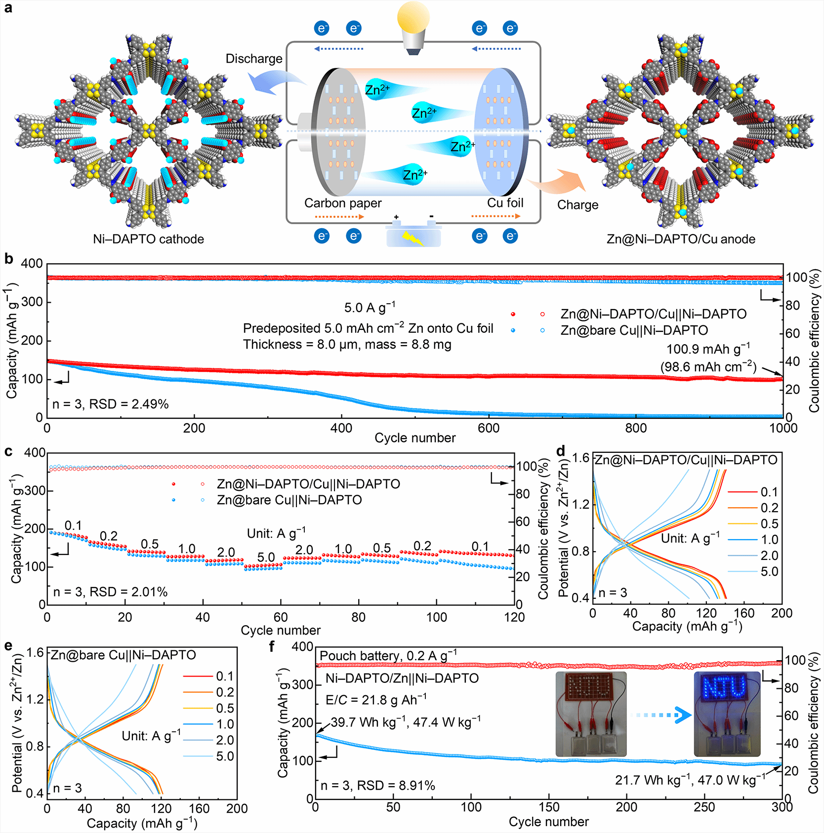 凯发k8官网金钟教授、左景林教授、马晶教授、颜亦超助理教授、铁祚庥工程师等提出了一种新型双功能COF材料Ni–DAPTO,旨在同步解决AZIBs中正极导电性和锌枝晶生长两大难题。通过在COF结构中引入Ni配位中心,Ni–DAPTO实现了预期的低能隙,显著增强了本征电子电导率。作为正极材料时,Ni–DAPTO在AZIBs中展现出卓越电化学性能:在0.5 A g??电流密度下循环10,000次后比容量达127.0 mAh g??,在10.0 A g??高电流密度下循环10,000次后仍保持119.7 mAh g??的优异比容量,每循环容量衰减率仅为0.0012%。另一方面,当作为锌负极人工SEI层时,Ni–DAPTO能引导Zn??均匀沉积并有效抑制枝晶形成。由Ni–DAPTO正极和修饰锌负极组装的全电池在长期循环中库仑效率(CE)稳定超过99%,在5.0 A g??下循环1,000次后放电容量为100.9 mAh g??。这种双功能特性彰显了Ni–DAPTO在解决AZIBs正负极问题上的潜力,可显著提升电池寿命、安全性和能量效率。本研究阐述了Ni–DAPTO COF的设计、合成与电化学性能,展示了其作为新一代AZIBs材料的应用前景。通过增强正极导电性和稳定负极抗枝晶生长,Ni–DAPTO为开发长效高效锌离子电池设立了新标准。这种双功能设计策略有望拓宽有机电极材料的应用范围,并激发该领域更广泛的研究兴趣。
