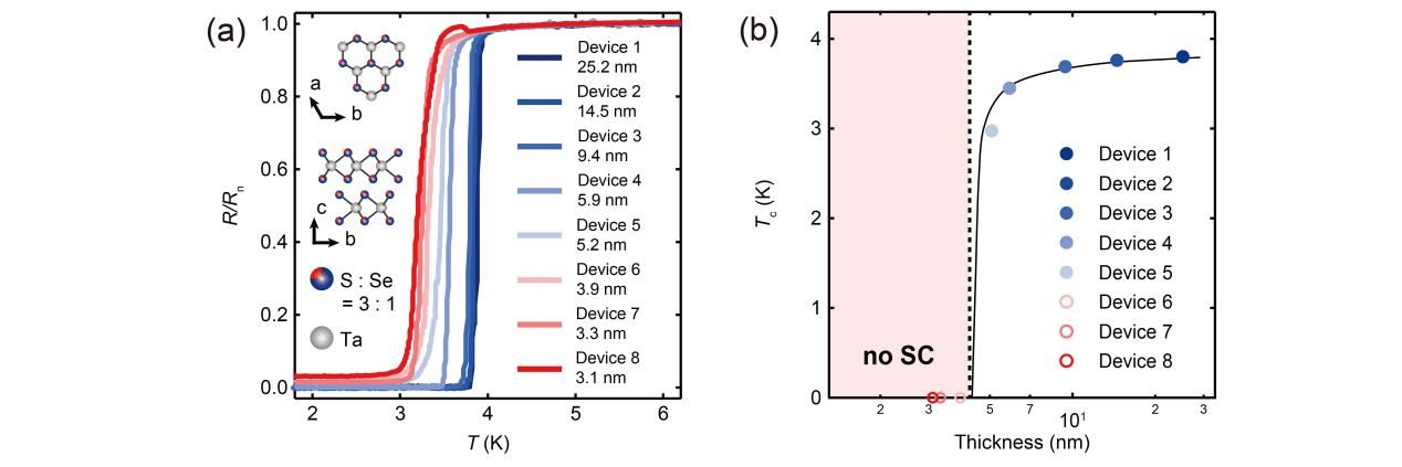 在该工作中,合作团队成功设计并合成了二维伊辛超导体Ta2S3Se,并通过低温强磁场条件下的电学输运实验,揭示了该材料在不同厚度下的输运性质。当器件中样品厚度大于10nm时(器件1和2),在约3.8K时电阻迅速降至零,呈现出基本的超导特征。而样品厚度低于10nm(器件3至5)时表现出超导转变温度随着厚度减薄而快速降低的现象。值得注意的是,当样品厚度接近二维极限(3nm)时,纵向电阻在低温下没有完全消失并且呈现出饱和的趋势。以上结果表明该层状伊辛超导材料在样品维度变化下呈现出反常的量子行为。