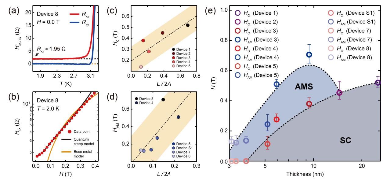 图3.(a)器件8在零磁场条件下Rxx和Rxy随温度的变化曲线。(b)Rxx随磁场的变化趋势及其基于量子蠕动模型和玻色金属模型的拟合曲线。(c,d)临界磁场HC和HAM随特征尺寸比例L/2Λ的变化关系。(e)维度与磁场的相图。
