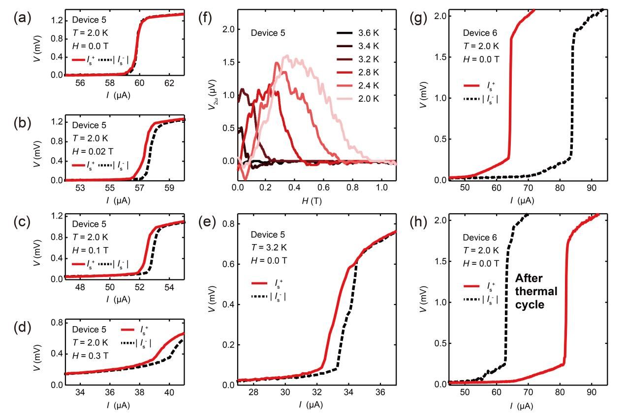 图4.(a–d)器件5在2K条件下,在不同磁场(0.0T、0.02T、0.1T和0.3T)下的V-I曲线。(e)器件5在零磁场和3.2K条件下的V-I曲线。(f)器件5在不同温度下,磁场作用下的二倍频电压信号变化。(g)器件6在零磁场、2K条件下的V-I曲线。(h)经过热循环过程,器件6在零磁场条件下的V-I曲线。