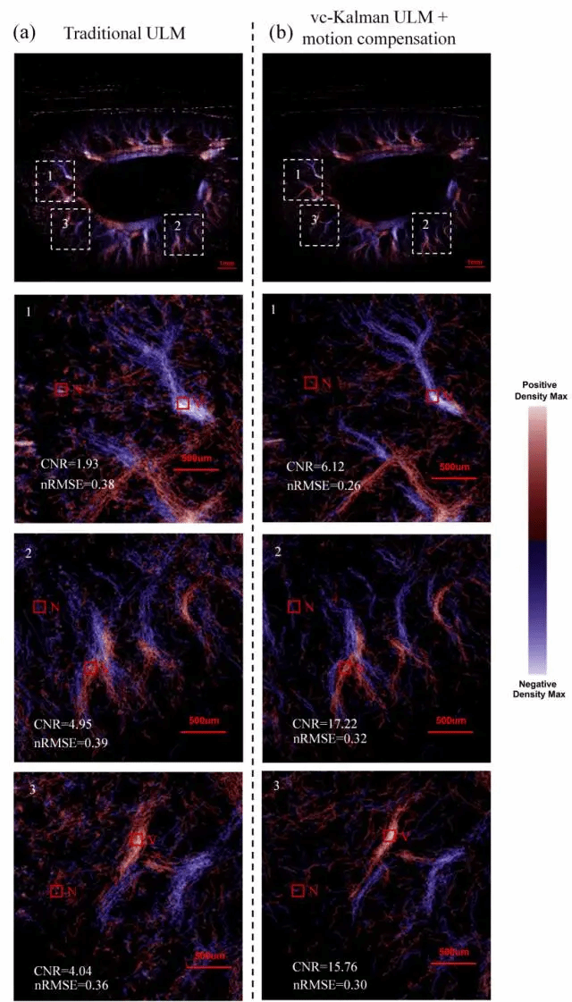 (2)自适应运动补偿机制:结合动态规划与互相关搜索,有效消除呼吸、心跳等组织生理运动带来的图像扰动,确保在心、肾等生理运动幅度较大的器官中也能重建出高精度的超分辨率血流通路图像。大鼠肾皮质中微血流成像(图2)实验结果显示,基于动态规划的互相关搜索过程可实现有效的运动补偿,成功抑制了大鼠肾脏因呼吸、心跳及轻微组织运动而产生的噪声和扰动,清晰显示微小血管的边缘轮廓,图像信噪比(CNR)和误差指标(nRMSE)全面优于传统算法。